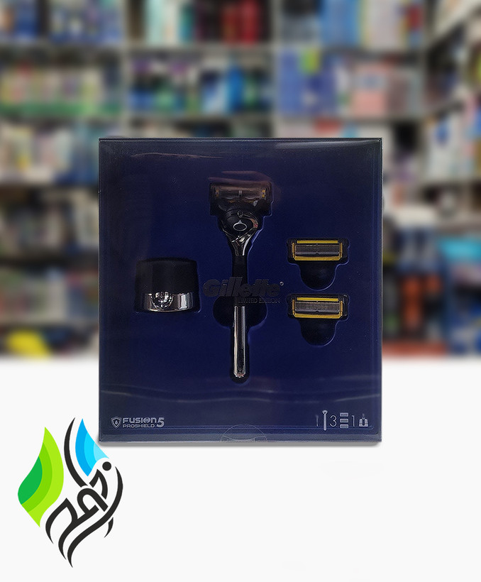 ست مردانه Gillette Fusion 5 Prosheld دارای دو سری تیغ یدک اضافه و یک سری تیغ به همراه خودتراش و پایه نگهدارنده مغناطیسی آن میباشد .