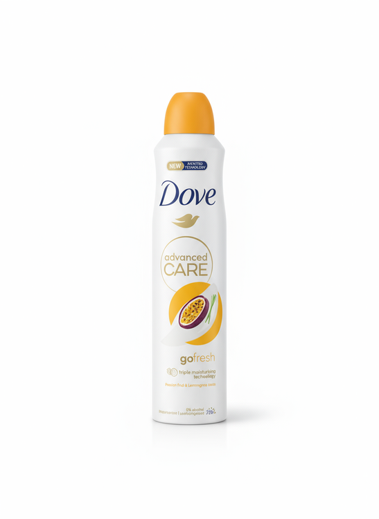 اسپری داو Go Fresh با رایحه انرژیبخش پشنفروت و عطر ملایم لمونگرس، ماندگاری ۷۲ ساعته و محافظت نرمکننده.