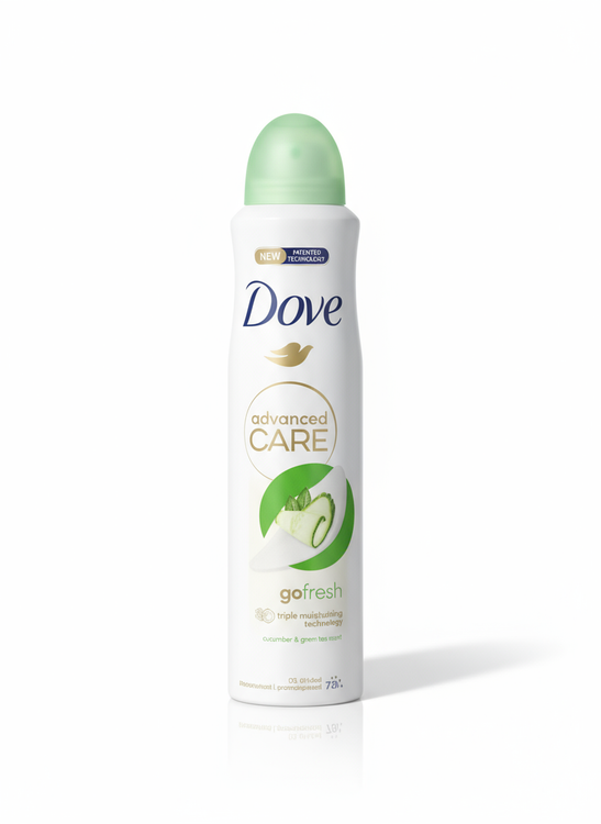 اسپری داو Go Fresh با رایحه خیار و چای سبز، ماندگاری ۷۲ ساعته و تکنولوژی سهگانه مرطوبکننده برای پوستی نرم و تازه.